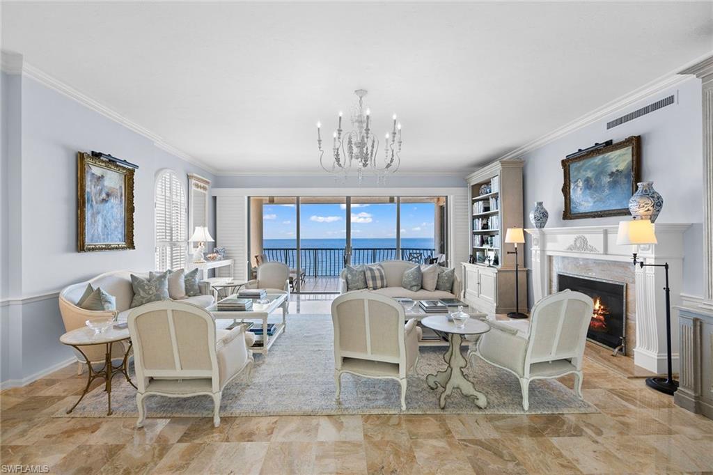 This rarely available Southern facing Penthouse, located on the 9th floor, offers exceptional panoramic views of the Gulf of Mexico. With 3,788 square feet, this Via Delfino home includes three bedrooms plus den and four full baths, expansive balconies, and a beachfront lanai to enjoy the iconic Naples sunsets and miles of white sand beaches. The living room features a wet bar with wine cooler and marble floors throughout. The highly sought-after top floor unit boasts 10-foot ceilings with skylight, in addition to new impact windows and sliders. The luxury nine-story boutique building has 24 units with three residences per floor, secured entry and is pet friendly. Updated building features include a whole-building generator, new roof, lap pool and grill area. Via Delfino is conveniently located on Gulf Shore Boulevard, just steps from the anticipated new Four Seasons, and minutes from dining and shopping in downtown Naples.