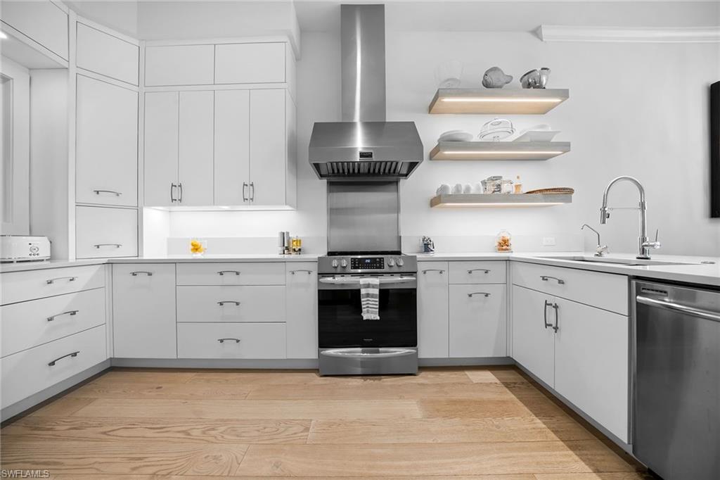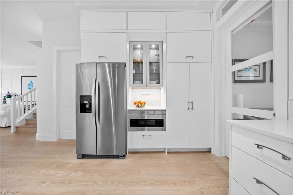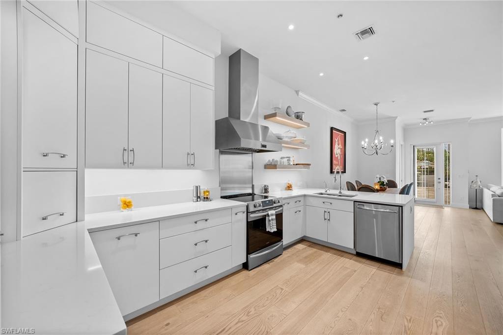 Positioned in the heart of Old Naples, this beautifully renovated villa in Villa Napoli offers the ideal blend of privacy, style and effortless coastal living. Renovated in 2020, the residence introduces wide-plank hardwood flooring throughout the main living areas and a clean, modern aesthetic designed for comfort and sophistication. The open-concept kitchen has been thoughtfully redesigned with custom cabinetry and high-end finishes, creating a relaxed yet elevated casual chef's kitchen that flows seamlessly into the living and dining spaces. A custom built-in media console with an automated lift-up television enhances the minimalist design, allowing for a sleek, uncluttered presentation when not in use. The flexible floor plan offers three bedrooms upstairs, along with a main-level den that functions beautifully as a private study, media room or overflow guest space. Upstairs, the spacious primary suite is highlighted by a charming bay window, dual walk-in closets, and a fully renovated bath featuring double vanities, a soaking tub and separate shower. Two additional guest suites provide comfortable accommodations for family and visitors. The highlight is the private courtyard-style pool and spa, bathed in southern exposure and designed for quiet mornings or evening entertaining. Lushly framed and tucked along 8th Avenue South, this residence is just two blocks to 5th Avenue South and within easy distance to the beach. Offering the desired Old Naples lifestyle, accessibility, charm and low-maintenance ease, this villa delivers comfort of a single-family feel with the simplicity of townhouse living.