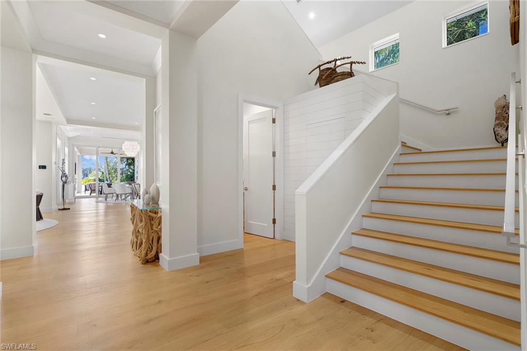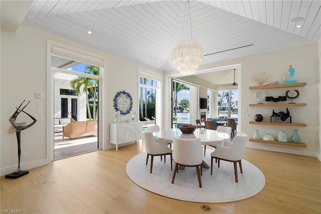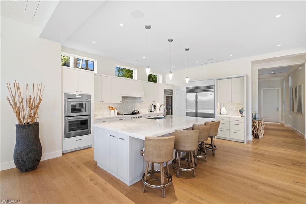 In the desirable Palm Circle neighborhood, this beautiful home designed by Kukk Architecture is a short four-block distance to the beach. With wide water, western lake views, this residence features spacious open living areas and a large gourmet kitchen. The home has five bedrooms and five baths, plus powder and pool bath and is 5,168 square feet under air and 7,033 square feet under roof. Additional features include an Artcraft designed kitchen with a Cristallo quartzite large center island, Wolf and Sub-Zero appliances, custom-designed Legno Bastone wide-plank French oak wood flooring, upgraded plumbing fixtures, custom-built cabinets, lighting and millwork. Exterior features include a large outdoor living area, electric rolldown screens and shutters, outdoor kitchen, Philippine shell-stone deck, mahogany garage doors and mahogany front door. Construction consists of concrete block on both levels, a full-home generator, home automation, and impact doors and windows for storm protection. Enjoy breathtaking Naples sunsets while sitting at the picturesque pool area, overlooking South Lake. This one-of-a-kind property provides the ideal resort-style experience in the heart of Old Naples with proximity to 5th Avenue South and Third Street South.